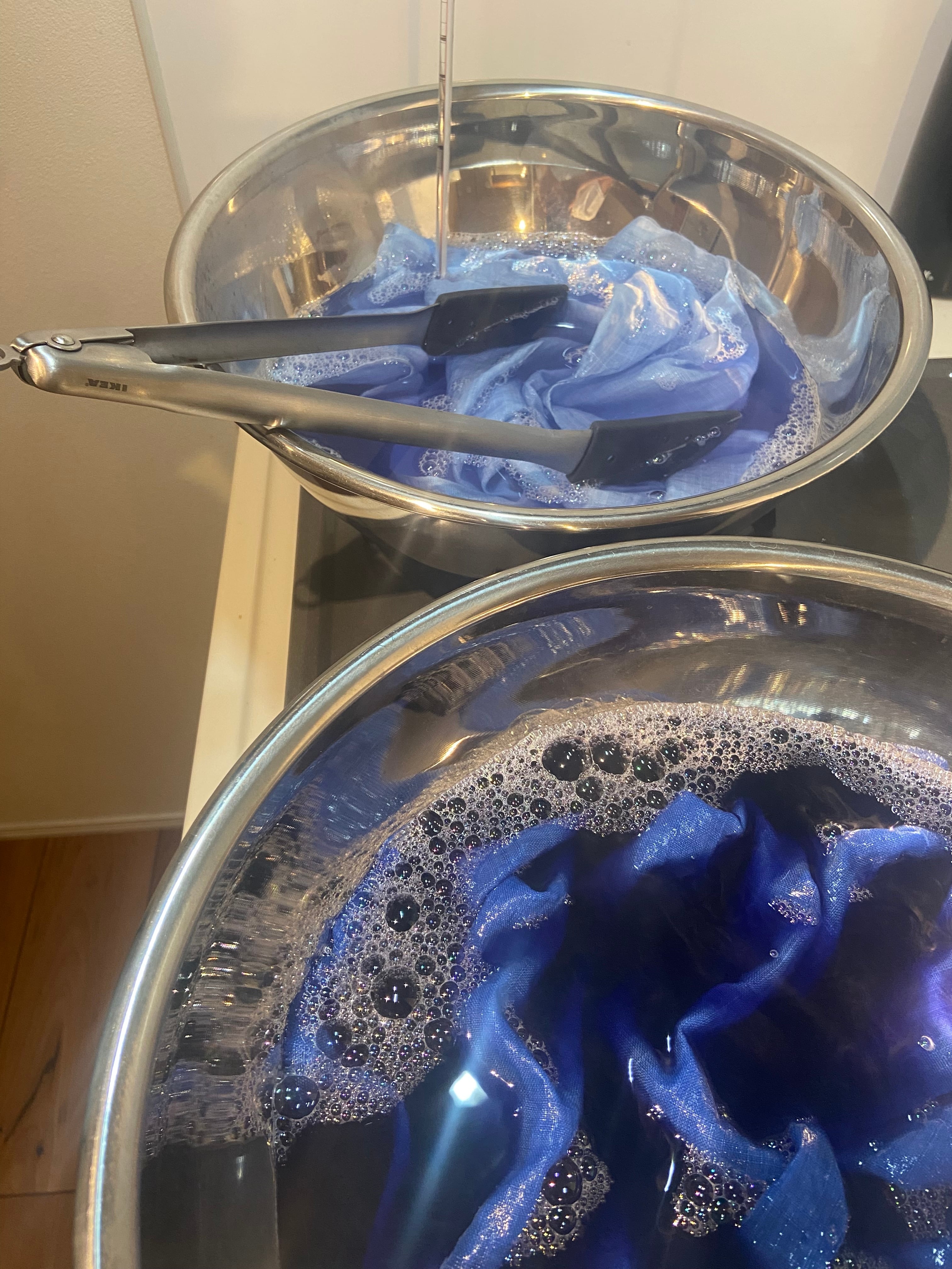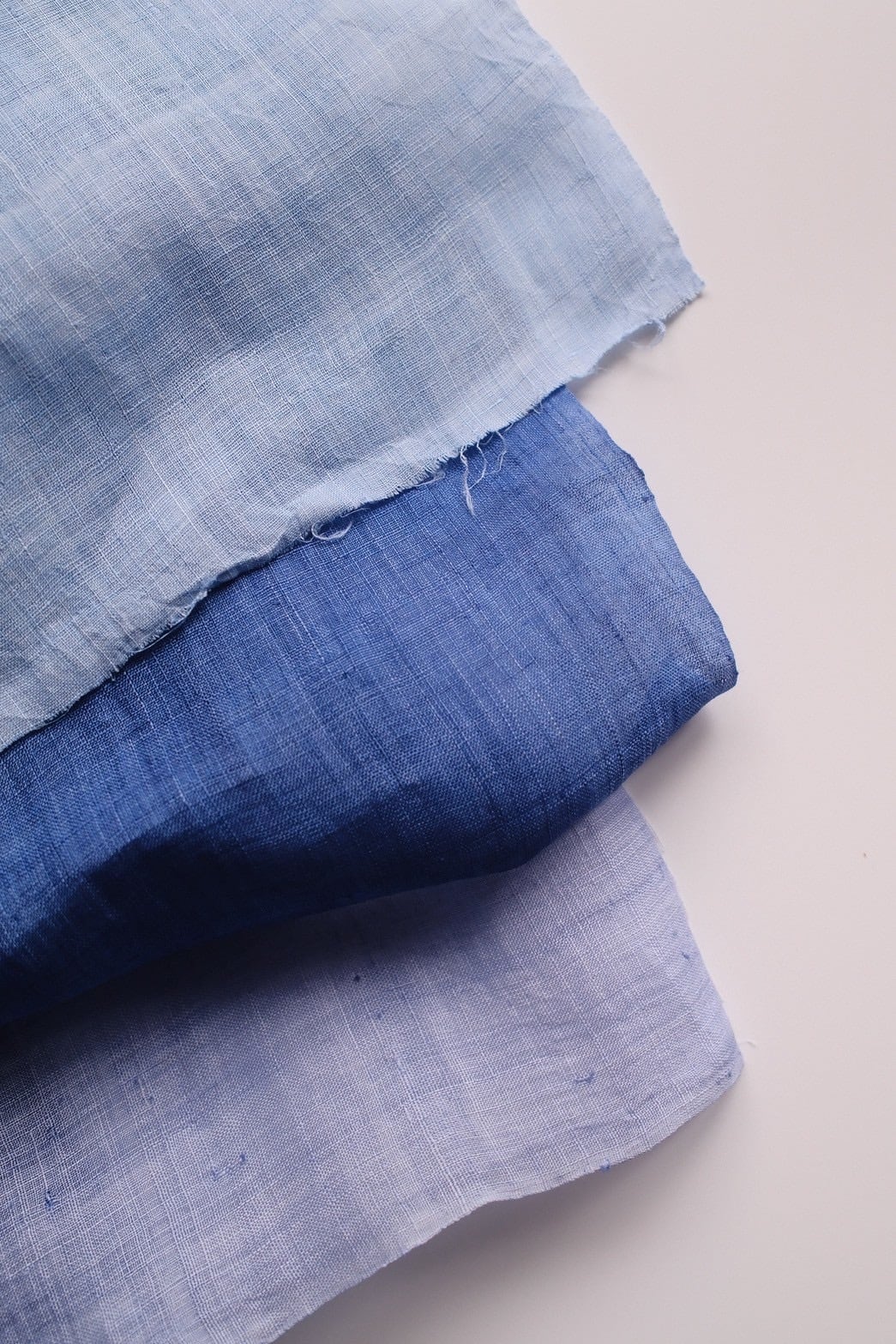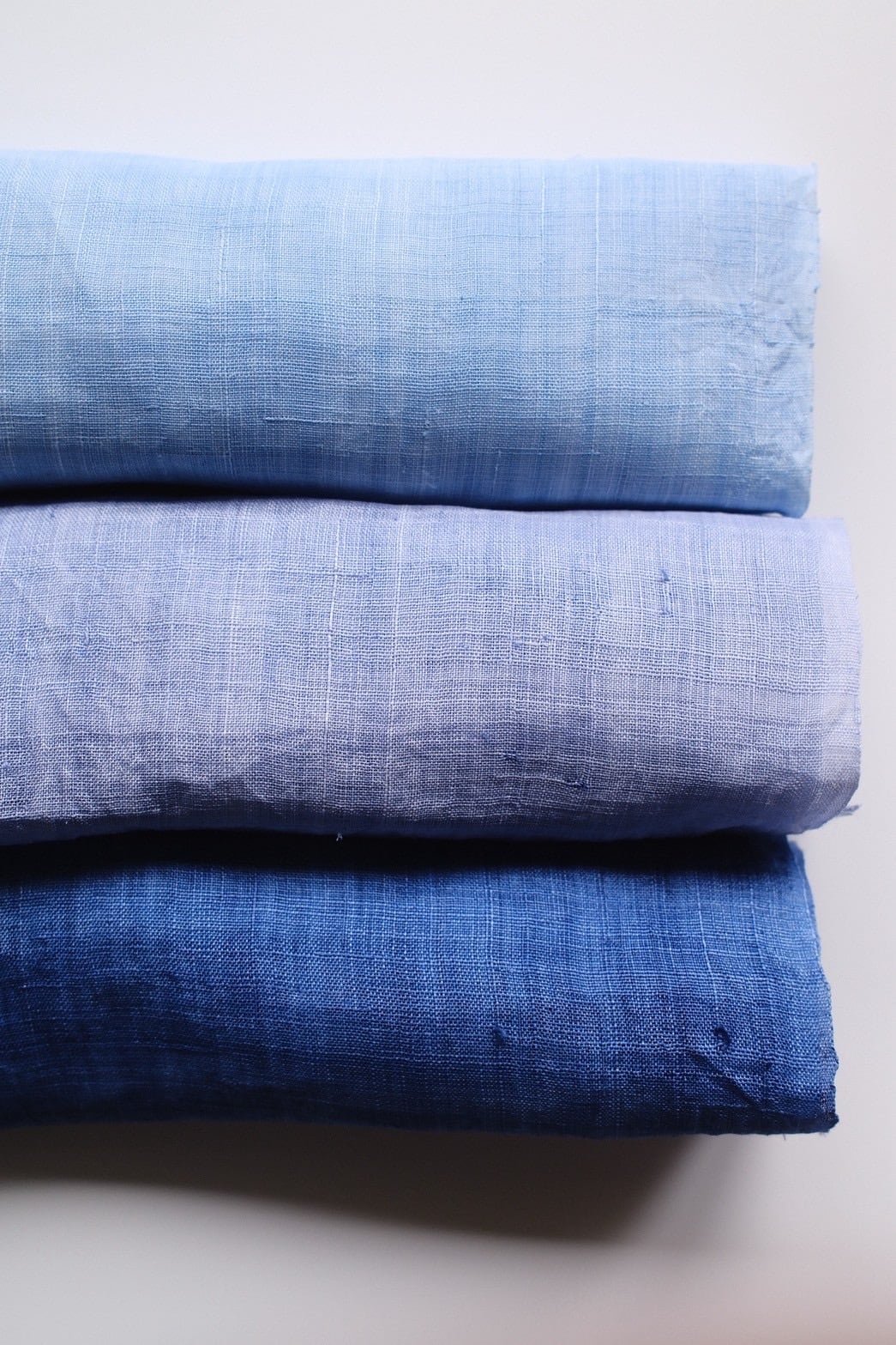 この商品は、@rocca.endoさんが心を込めて染め上げた特別なモシ生地です。濃い青、薄い青、水色の3色をご用意しており、それぞれが持つ美しい色合いと独自の風合いが、様々なシーンで大活躍します。
